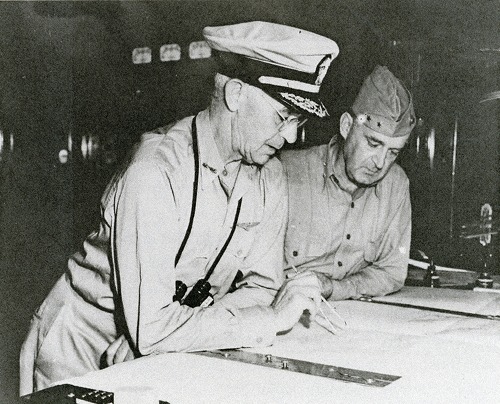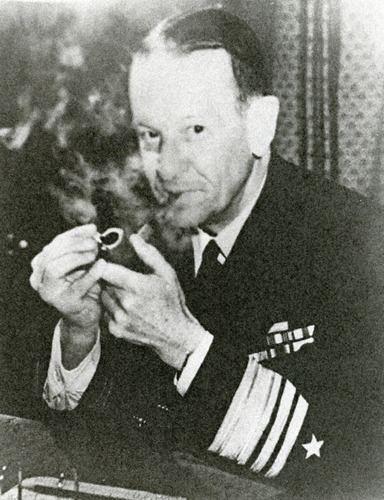 第一次ソロモン海戦 連合軍司令官、旗艦で離脱 連合軍のガダルカナル島への上陸艦隊司令官ケリー・ターナー少将は、まだ荷降ろしを完了していない貨物船も送り返すべきか、あるいは、もう一日、航空援護なしに上陸海岸沖に停泊させておく危険を冒すべきかを決断しなければならなかった。海兵隊が陸上で何を必要としているかにもよるが、彼はヴァンデグリフトに無線で問い合わせるよりも、その夜、自分の旗艦である攻撃輸送艦マコーリー艦上で打合せするよう呼び寄せた。 ターナーはまた、英国海軍のビクター・クラッチリー少将も招いた。彼は侵攻海岸を敵の水上部隊から守る巡洋艦・駆逐艦部隊を指揮していた。砂色の髪をして髭を伸ばしたクラッチリーは、ほんの数週間前にオーストラリア海軍に出向していた。第一次世界大戦で