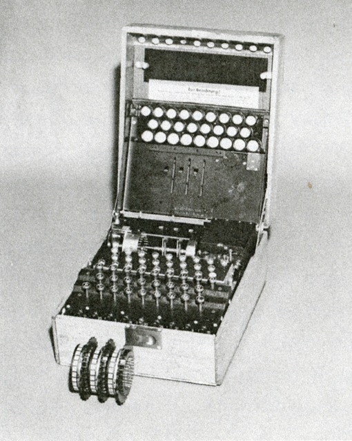 戦後に撮影されたエニグマ・マシンの写真。前面に展示されている3つのローターが、キーボードの後ろのスロットに装着され、回転する。1942年2月、ドイツ海軍は海軍用エニグマ・マシンに4番目のローターを追加した。それによって、連合軍は1943年3月まで、ドイツ海軍の通信文の内容を知ることができなかった。