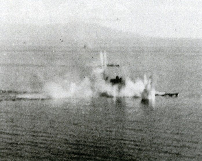 この写真はアメリカの爆撃機から撮影されたもので、1944年10月24日にシブヤン海で攻撃を受ける日本のスーパー戦艦武蔵を写している。十数発の爆弾と同数の魚雷を受けて、その夜沈没した。