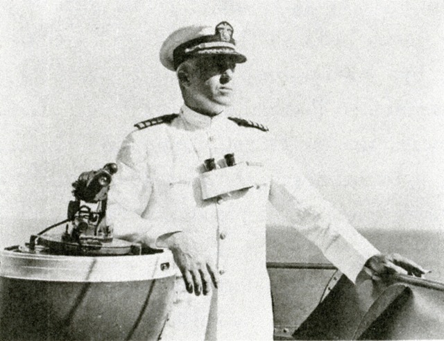 重巡洋艦サンフランシスコの艦橋ウイングにおいて、白正装姿でポーズをとるダニエル・J・キャラハン少将。この場所は1942年11月13日、第三次ソロモン海戦で日本戦艦比叡の14インチ砲弾を浴びて戦死した場所の近くである。